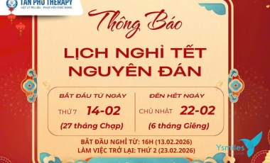 - Nghỉ 01 ngày: Thứ Năm, 01/01/2026 - Hoạt động trở lại bình thường: Thứ Sáu, 02/01/2026 - Nhân dịp năm mới, Tân Phú Therapy kính chúc Quý khách hàng và gia đình: - Sức khỏe dồi dào